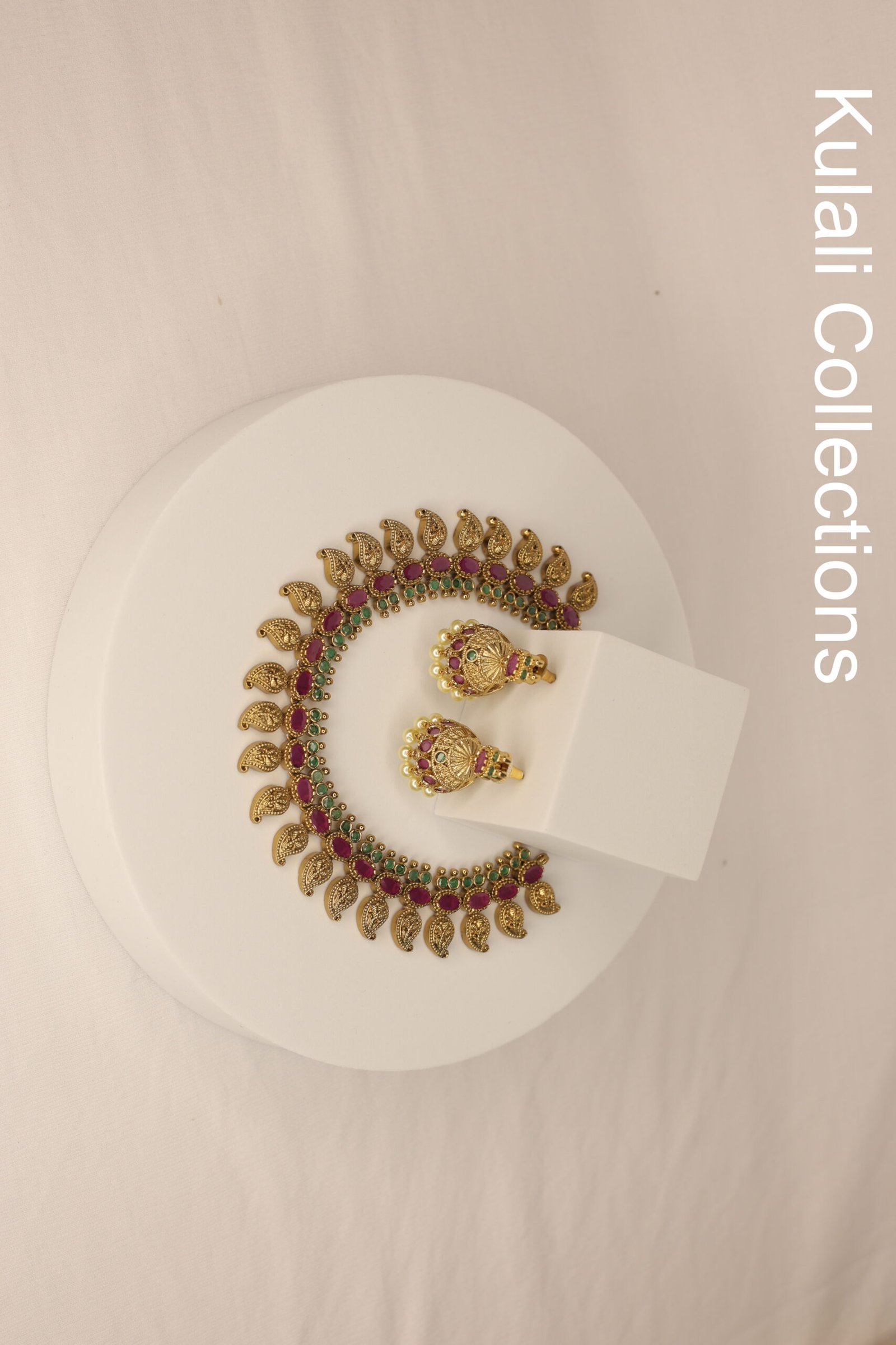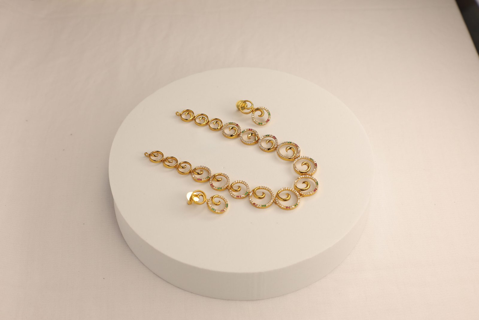 Designer gold-plated necklace set with sparkling stones and matching jhumka earrings.