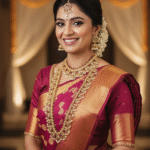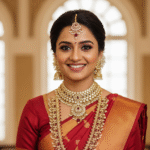 This South Indian bridal set consists of an opulent long haram and a complementary necklace, crafted with intricate gold-plated motifs and elegant detailing. The haram and necklace are studded with rich ruby red stones and accented with clusters of lustrous pearls, creating a striking contrast and traditional appeal. The set is completed with matching earrings and maang tikka, all featuring similar motifs and embellishments for a flawless bridal ensemble. Perfect for weddings and grand celebrations, this jewelry captures the magnificence of traditional bridal aesthetics with modern craftsmanship and skin-friendly finishes.