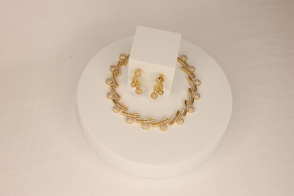 This luxurious jewelry set features a pair of gold earrings and a matching necklace, elegantly arranged on a white circular platform. The earrings are mounted on a white cube stand, while the necklace gracefully encircles the base. Both pieces showcase intricate craftsmanship, with multiple small circular elements encrusted with sparkling diamonds. The neutral background enhances the brilliance and detail of the jewelry, making it a perfect choice for weddings, festive occasions, or upscale events.