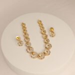 Crafted with high-quality materials, this set is designed for durability while reflecting elegance. Its lightweight build ensures comfort for prolonged wear, allowing you to revel in festivities with ease. Pair it with an embroidered saree, a flowing lehenga, or even a classic salwar suit to accentuate your look effortlessly. The warm gold-toned finish pairs seamlessly with both bold and muted hues, making it a versatile addition to your jewelry collection.