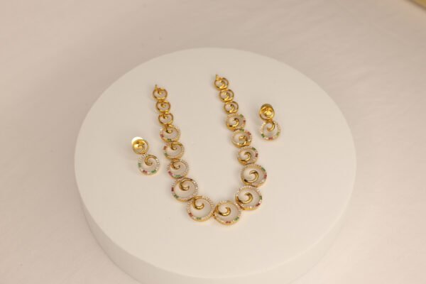 The necklace impresses with its intricate craftsmanship, combining the bright appeal of gold tones with the striking contrast of vibrant red stones. The earrings mirror the design in a refined overture, bringing harmony to the entire set. Whether you’re attending a celebratory event, a wedding function, or simply want to add that extra sparkle to a traditional outfit, this jewelry ensemble ensures you’re the centerpiece of admiration.