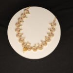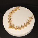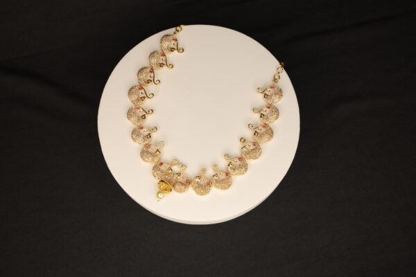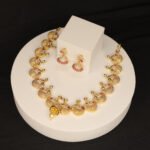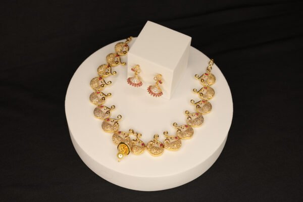 This exquisite necklace set is a blend of elegance and traditional artistry. The necklace features intricately designed circular motifs studded with shimmering white stones and ruby accents, finished with a pearl drop centerpiece. The matching jhumka-style earrings enhance its charm, making it a complete statement set for any special occasion. Crafted with fine detailing and high-quality gold plating, this jewellery set is ideal for weddings, engagements, and festive celebrations, adding a regal charm to your look.