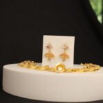 Designer gold-plated necklace set with sparkling stones and matching jhumka earrings.