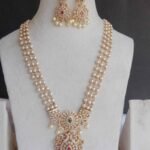This exquisite long haram set features three strands of lustrous pearls woven with gold-tone links, culminating in a striking dual peacock pendant centerpiece. The pendant is embellished with multicolored stones, including green and pink, meticulously arranged to highlight traditional South Indian artistry. Delicate pearl drops and intricate filigree work add to the grandeur, making it perfect for bridal or festive occasions. The matching earrings echo the pendantβs design, ensuring a coordinated and regal look.