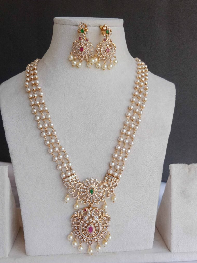 Elegant tri-layered pearl haram set with dual peacock motif pendant, adorned with sparkling stones and matching statement earrings.