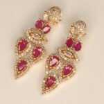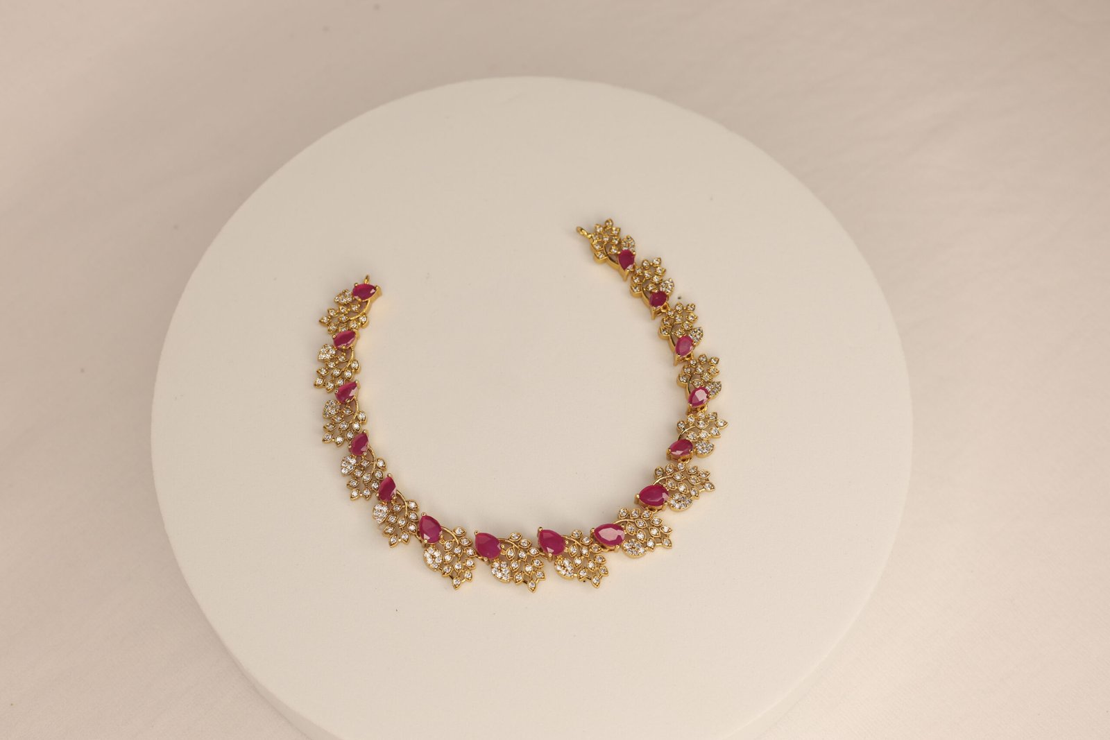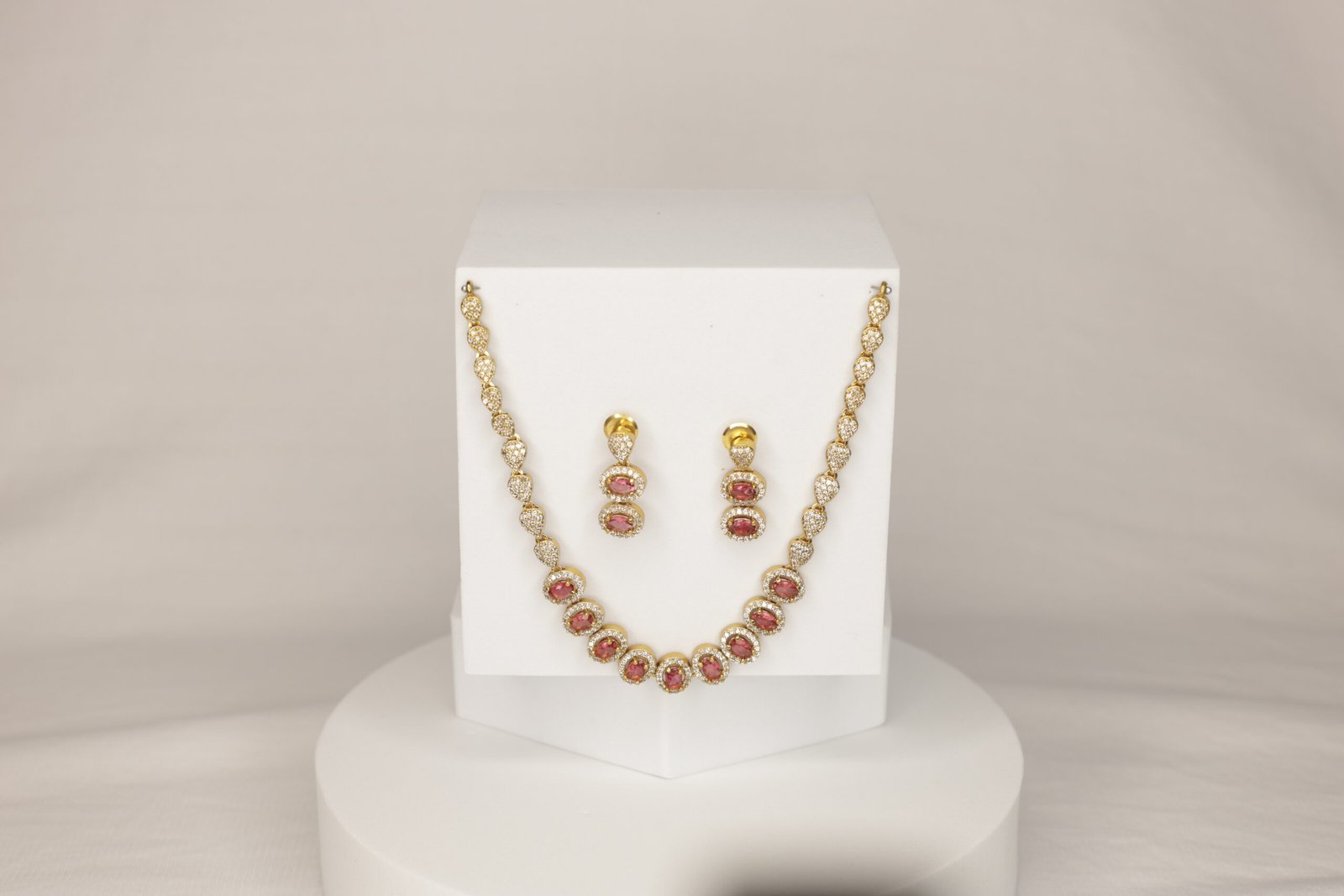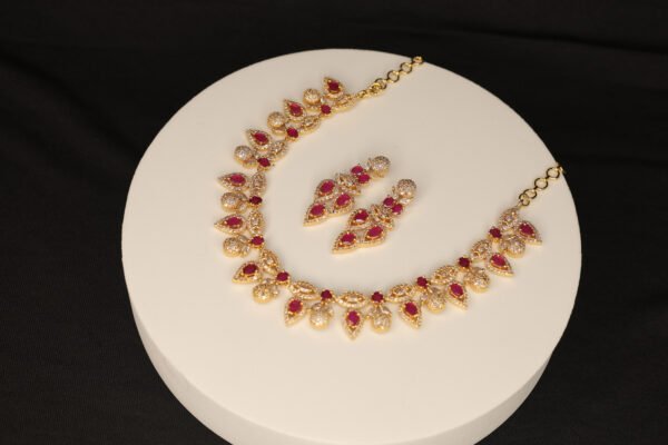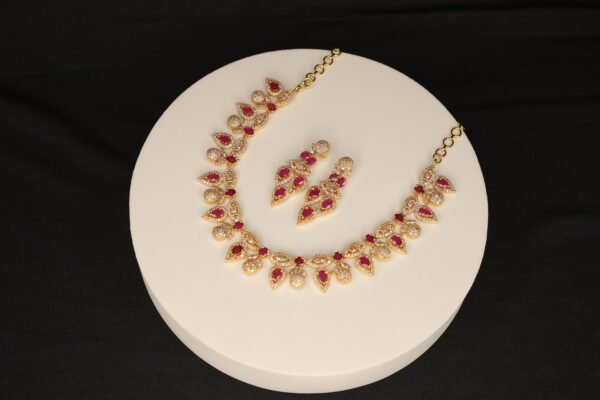 This exquisite jewellery set features a beautifully crafted gold-plated necklace adorned with ruby red stones and sparkling crystals, paired with matching drop earrings for a graceful and timeless look.