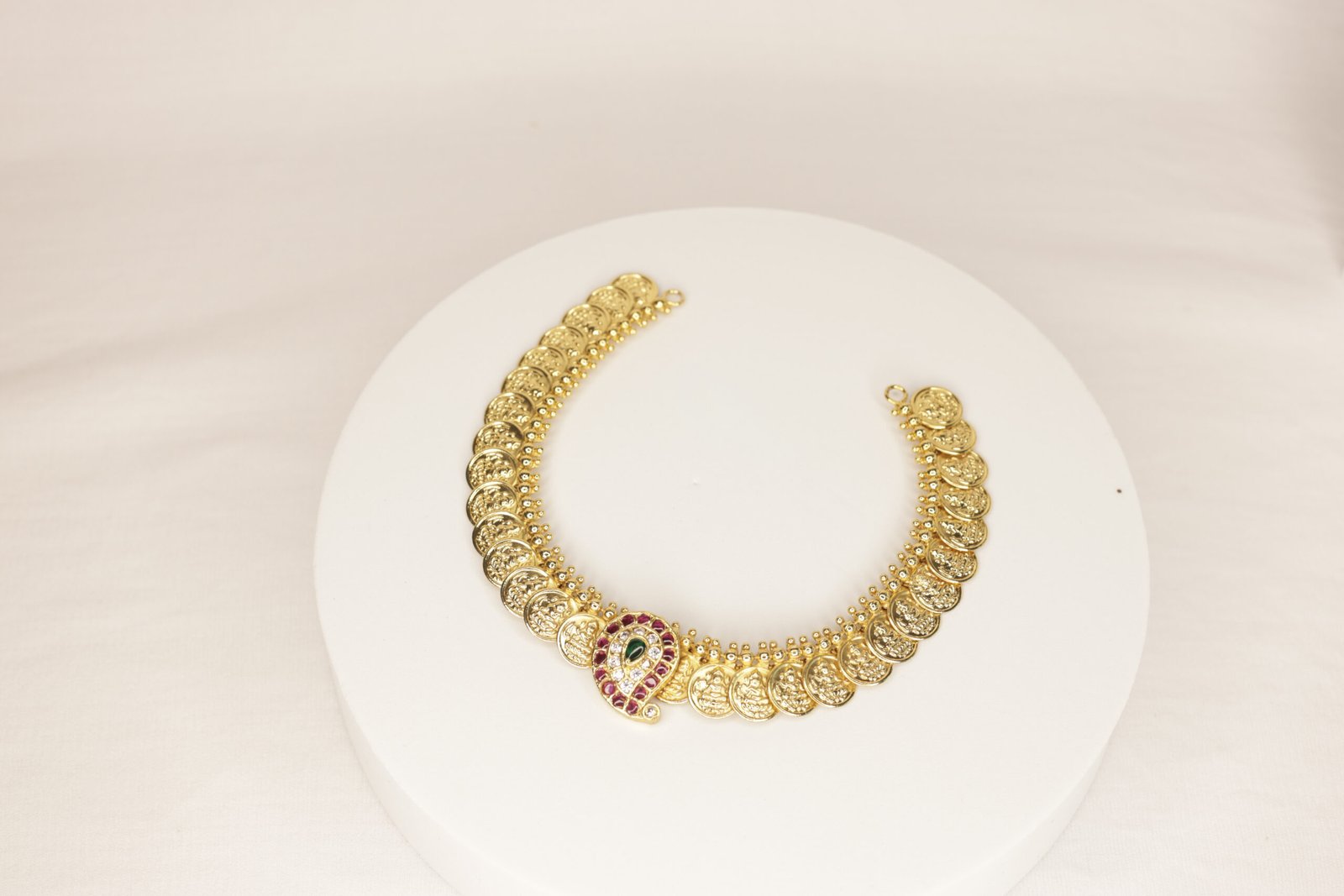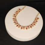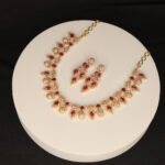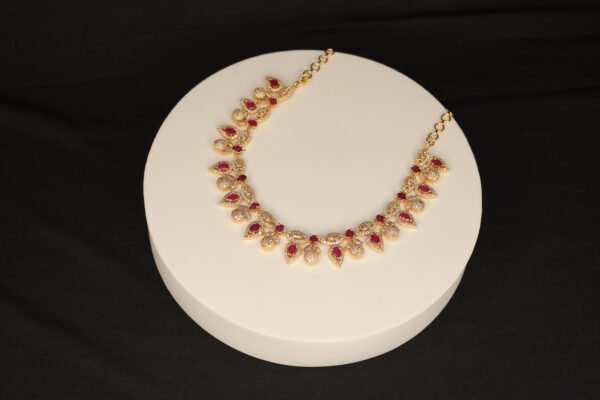 Add a touch of luxury to your collection with this stunning gold-plated necklace set. Designed with intricate detailing, it combines ruby red stones and shimmering crystals arranged in a floral-inspired pattern, giving a regal and sophisticated appeal. The matching earrings complement the necklace perfectly, making it ideal for weddings, festive occasions, and grand celebrations. Lightweight yet glamorous, this set balances elegance with comfort, ensuring you shine effortlessly wherever you go.