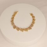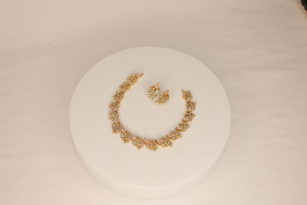 This exquisite jewelry set blends traditional charm with modern elegance. The bracelet showcases a bold, structured design with a central blush-pink stone surrounded by clusters of white crystals, creating a radiant floral motif. The matching earrings mirror this design, offering a cohesive and graceful look. Crafted from high-quality gold-toned alloy, the set is lightweight yet durable, ensuring comfort throughout long events. Ideal for bridal wear, festive celebrations, or gifting, this set adds a touch of sophistication to any outfit.