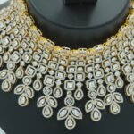 Make a grand entrance with Kulali Collections’ white stone rani necklace set. This opulent imitation piece features a heavy choker base encrusted with square and pear-cut CZ stones, flowing into delicate drop motifs, matched with elegant earrings. Ideal for the bride seeking timeless South Indian-inspired luxury without the hefty price.