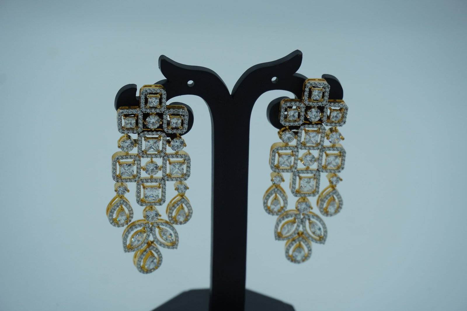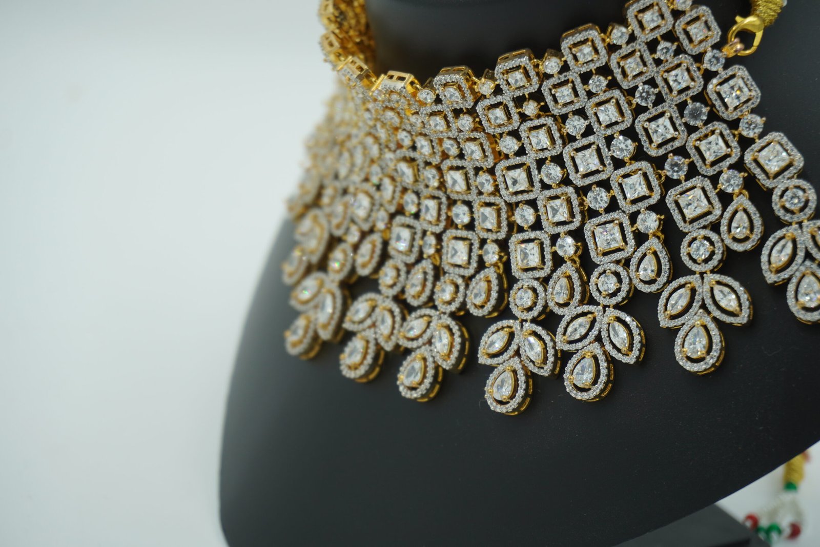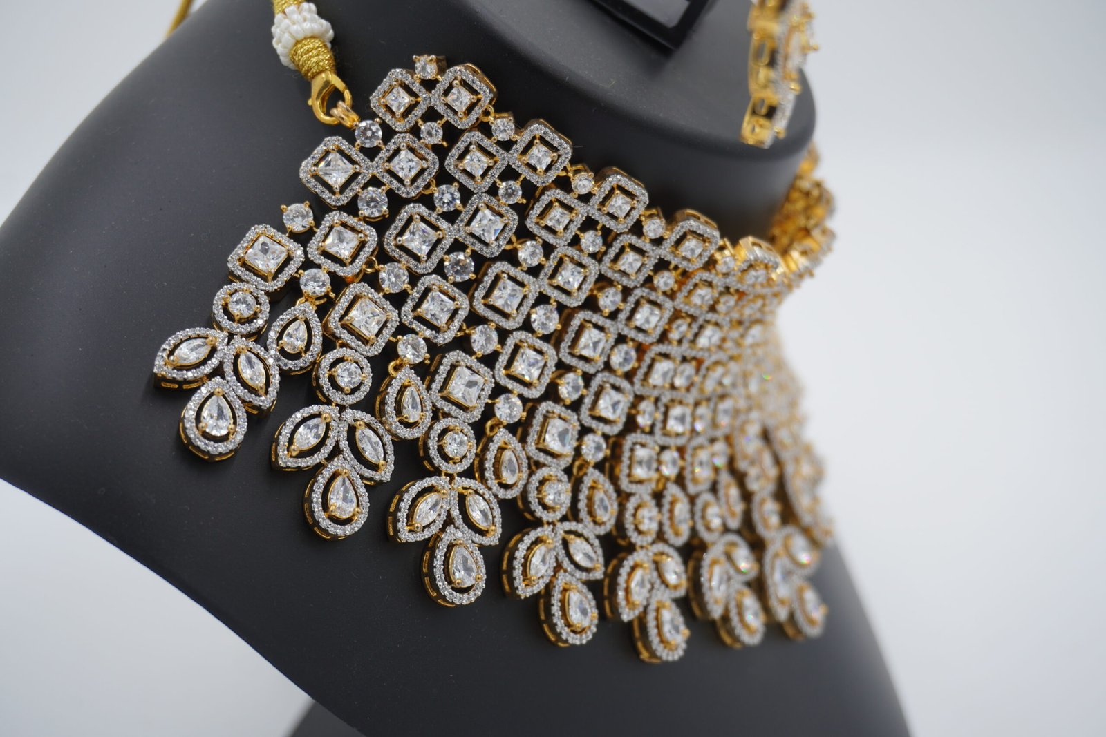 Statement Design: Bold multi-layered choker necklace with cascading white CZ stones and floral drops, paired with long dangling earrings for dramatic impact.
