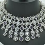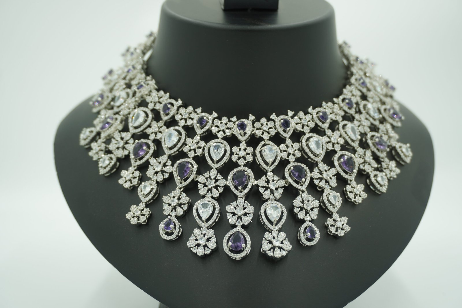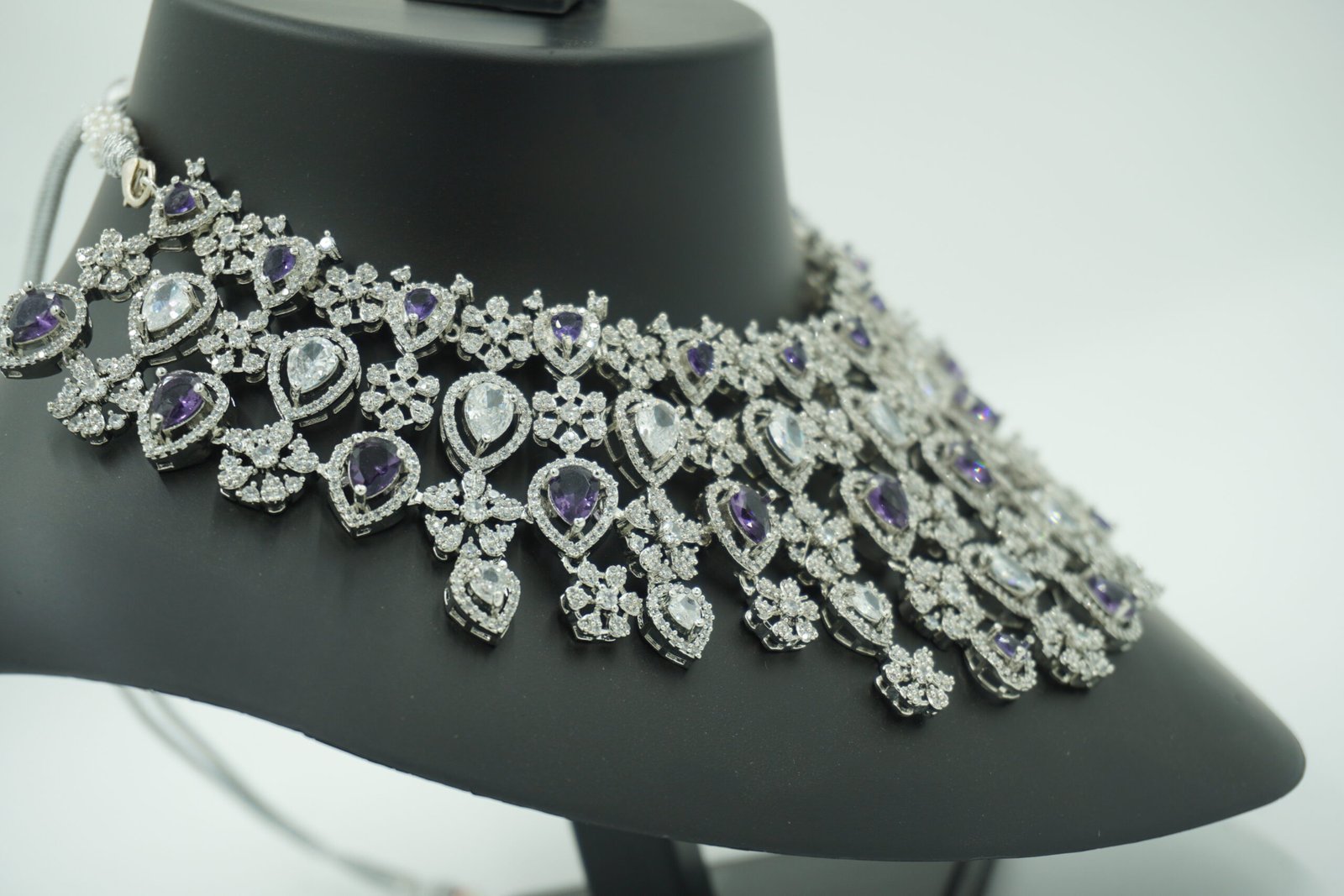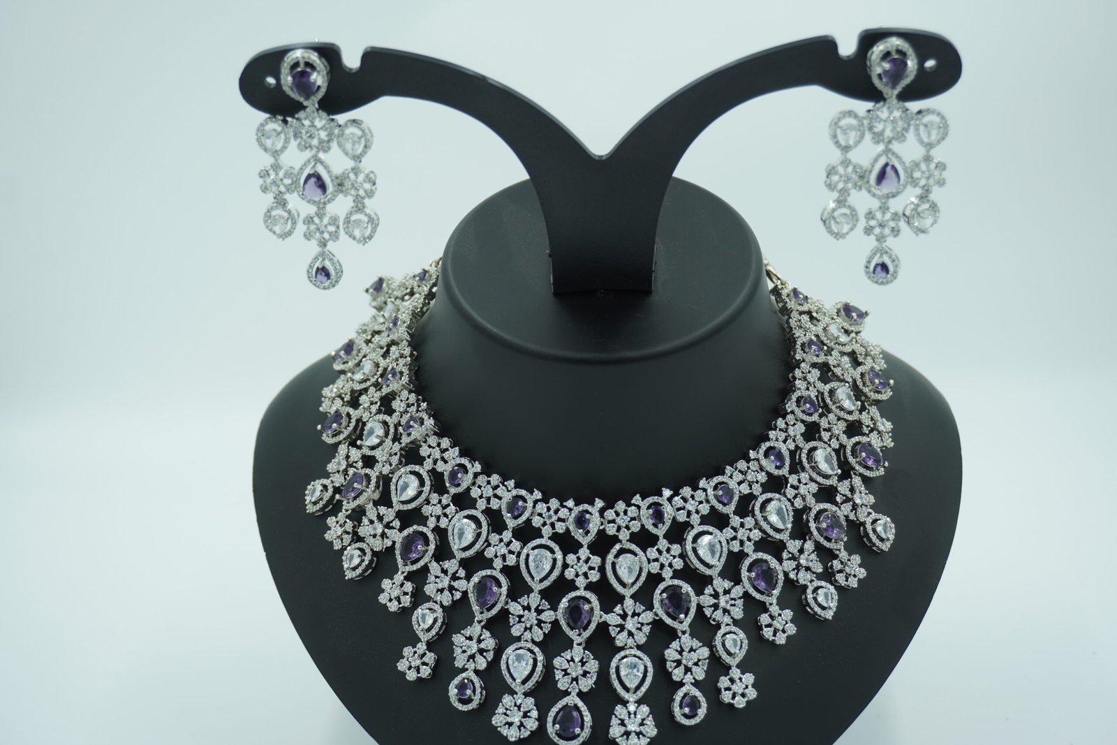 Purple amethyst imitation necklace set with chandelier earrings, ideal for bridal and festive wear from Kulali Collections.