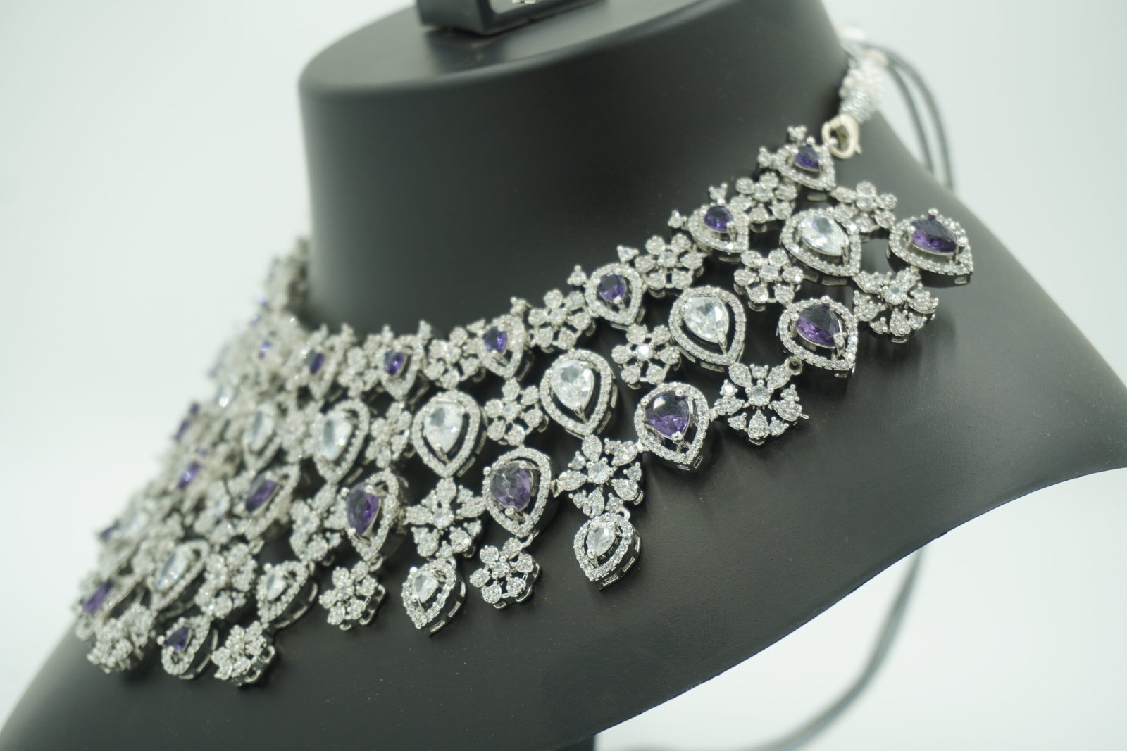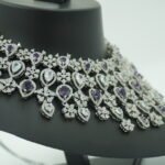 Elegant Design: Intricate white stone clusters with violet amethyst drops on a polished metal base, creating a luxurious chandelier effect for traditional South Indian temple jewelry look.