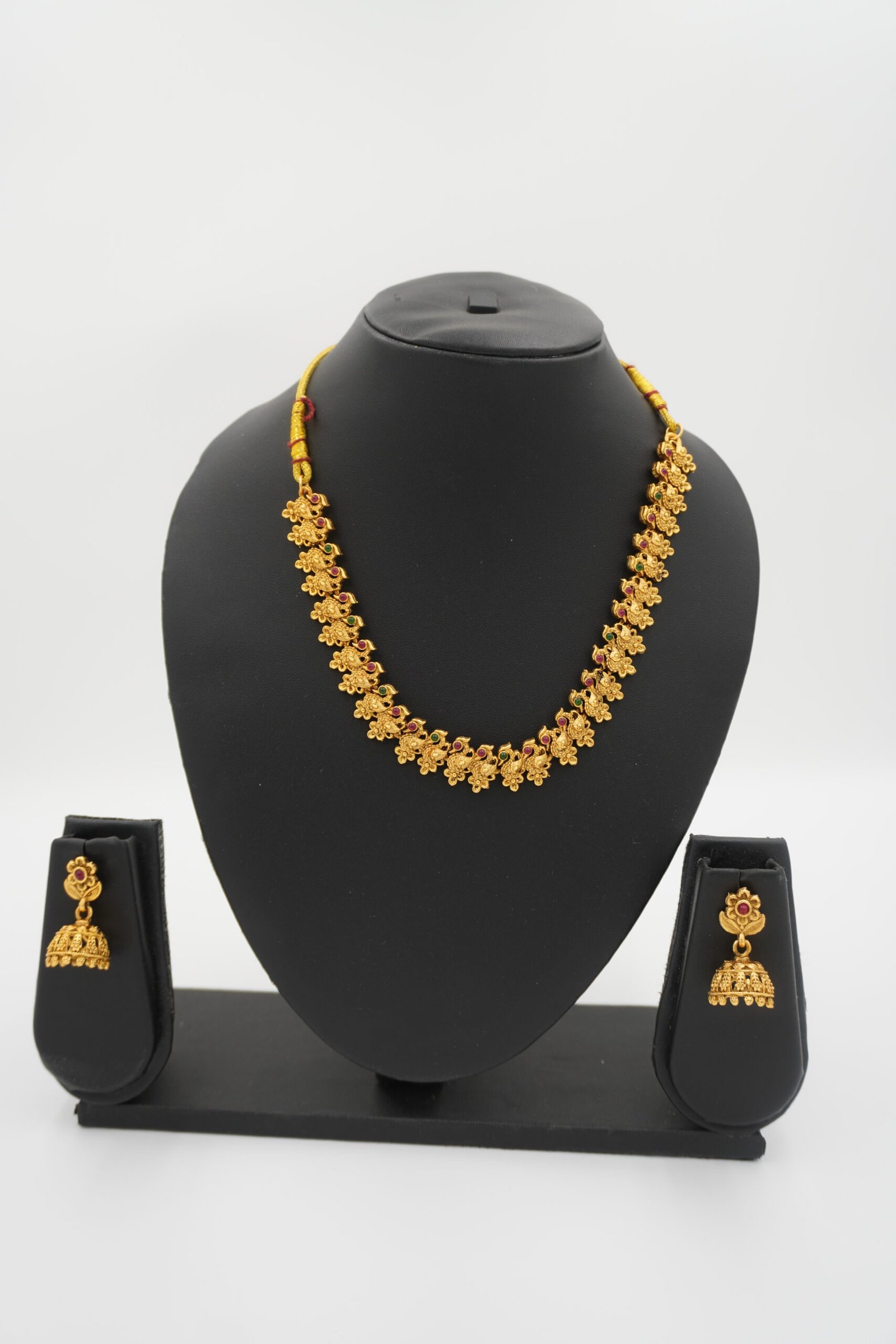 Embrace the timeless beauty of South Indian tradition with this gold-tone necklace set paired perfectly with matching jhumka earrings. Designed to showcase intricate floral motifs and shimmering red stone accents, this jewelry set adds sophistication and charm to your ethnic ensemble. Perfect for weddings, festivals, or any celebration, this set is sure to make you stand out.