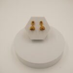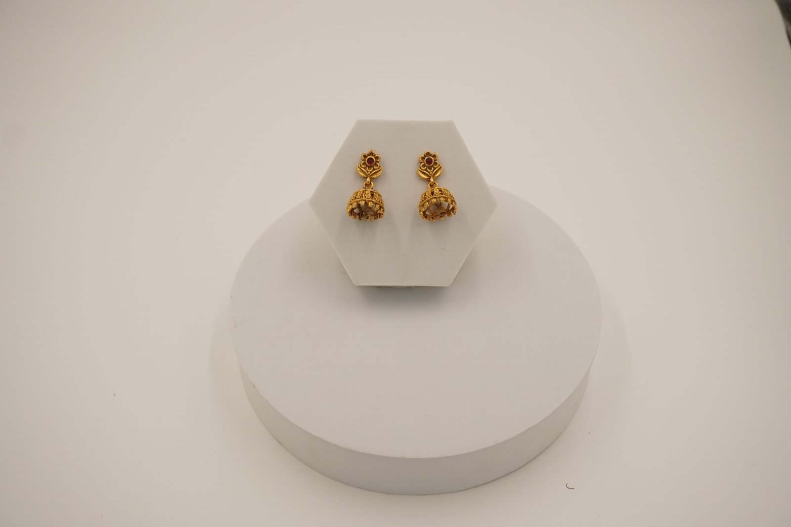 Earring style: Jhumka earrings with floral stud and dome-shaped drop.