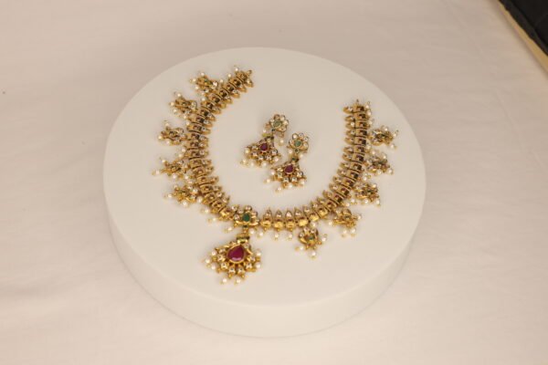 This exquisite jewelry set features a traditional gold necklace and matching earrings, beautifully displayed on a round white platform. The necklace is crafted with intricate gold links, each embellished with delicate pearls and vibrant gemstones in green, red, and white. At its center lies a striking pendant with a bold red gemstone encircled by pearls, adding a regal touch. The earrings mirror the necklace’s design, featuring similar gemstone and pearl arrangements. Perfect for weddings, festivals, and cultural celebrations, this set blends timeless elegance with rich craftsmanship.