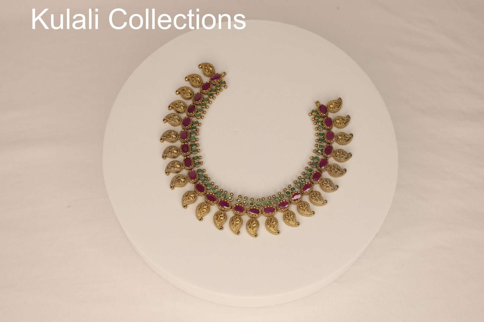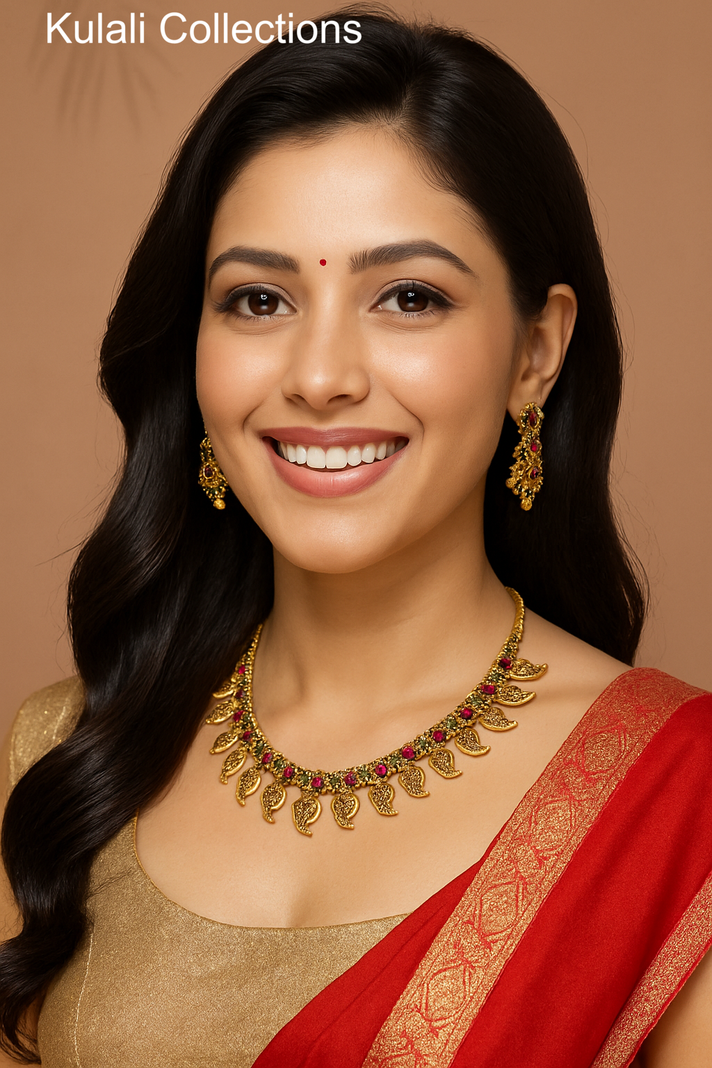 This elegant Kulali Collections necklace showcases a harmonious blend of ruby-red and emerald-green stones set in a gold-plated base. Featuring intricate paisley motifs, the design exudes timeless charm and traditional craftsmanship. Perfect for weddings, cultural celebrations, and festive gatherings, this necklace enhances your ethnic attire with grace and sophistication. Pair it with matching earrings or bangles to complete the look.